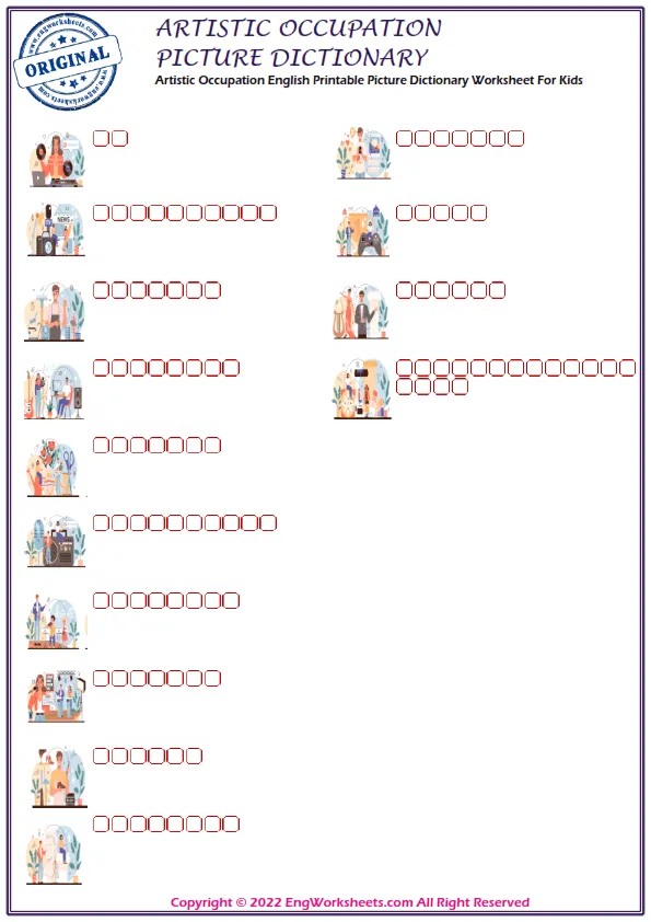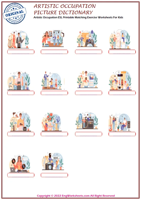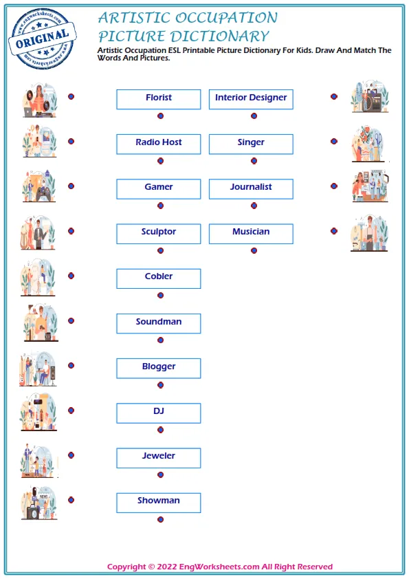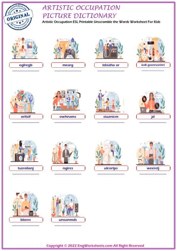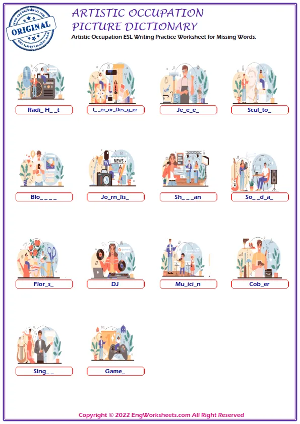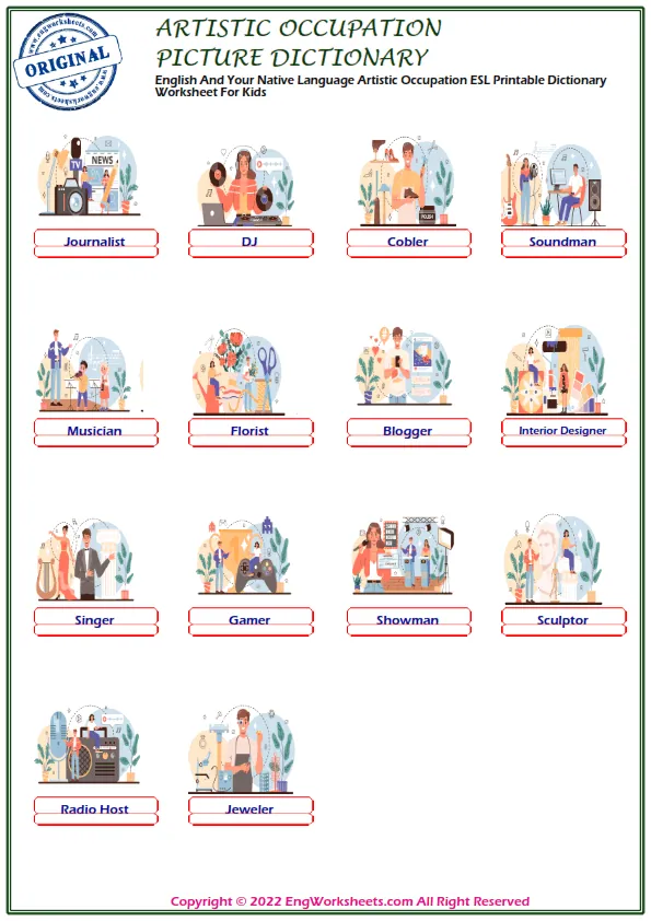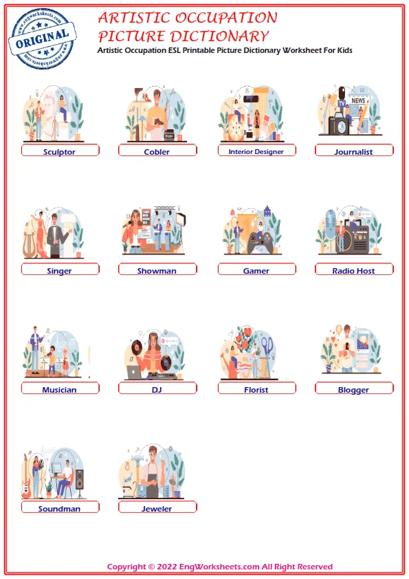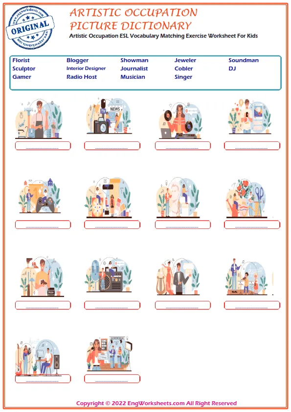 Artistic occupations are a fantastic way to promote creativity and self-expression. If you're an ESL teacher looking for engaging and fun ways to teach English vocabulary to your students, you'll want to check out these Artistic Occupation ESL printable English worksheets and exercises. These resources are perfect for kids and will make learning English more enjoyable.
