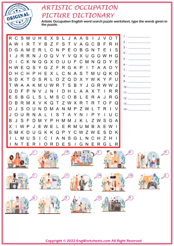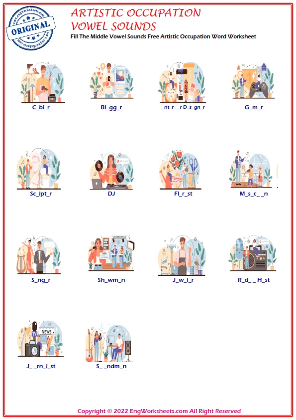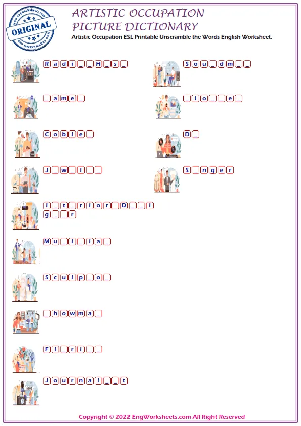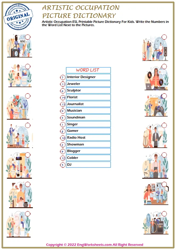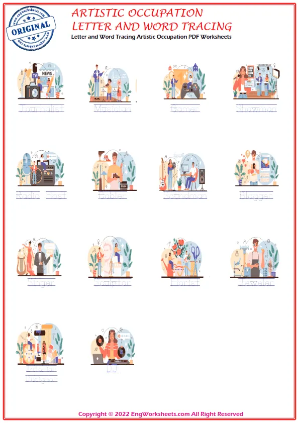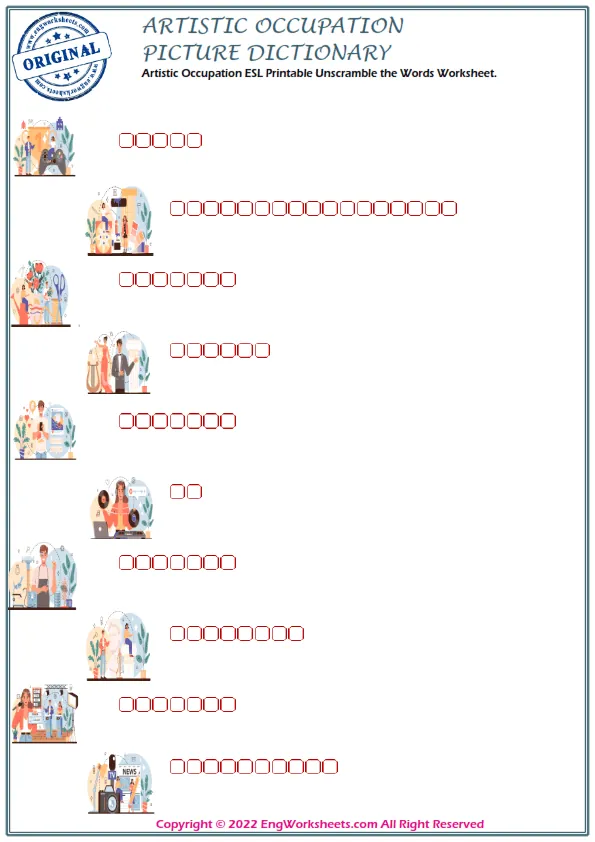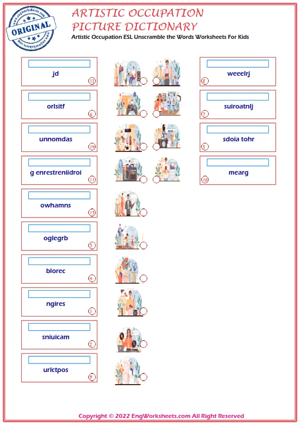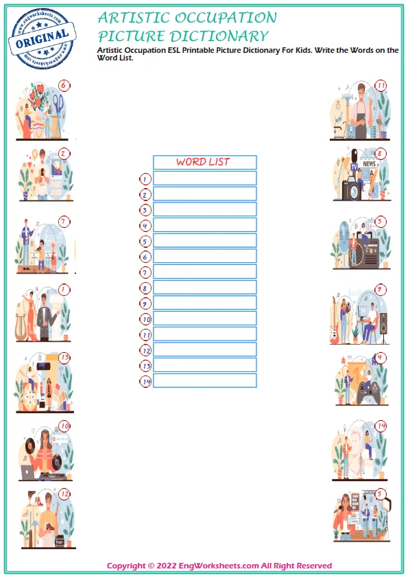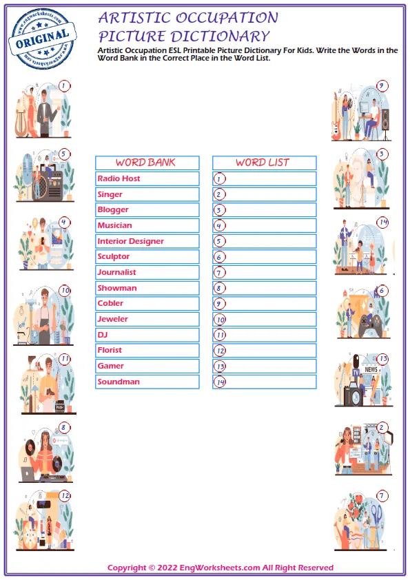 Artistic occupations are a fantastic way to promote creativity and self-expression. If you're an ESL teacher looking for engaging and fun ways to teach English vocabulary to your students, you'll want to check out these Artistic Occupation ESL printable English worksheets and exercises. These resources are perfect for kids and will make learning English more enjoyable.