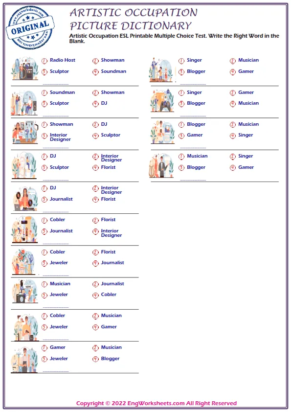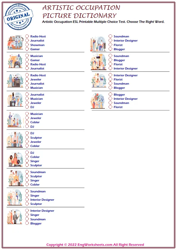 Finally, you can use the Multiple Choice English Tests to assess your students' understanding of the vocabulary related to artistic occupations. These tests are a great way to evaluate students' progress and ensure they're retaining what they've learned.