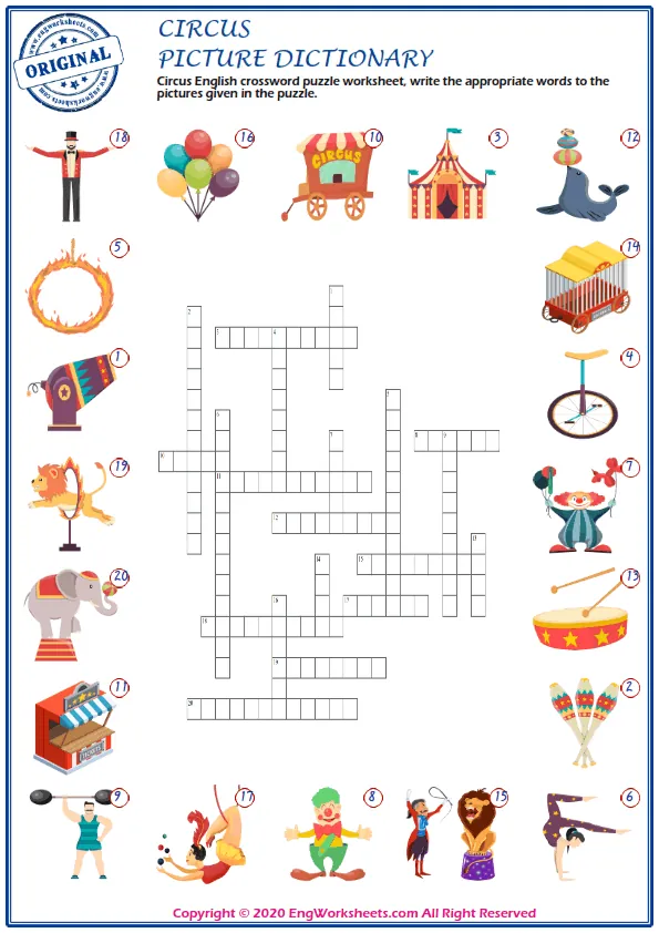 One type of Circus Free Printable English ESL Vocabulary Worksheet is the Illustrated Crossword Worksheet. This worksheet includes a series of pictures and clues related to the circus, with students being asked to fill in the crossword puzzle with the appropriate words. By completing this exercise, students can become more familiar with a variety of vocabulary related to the circus.
