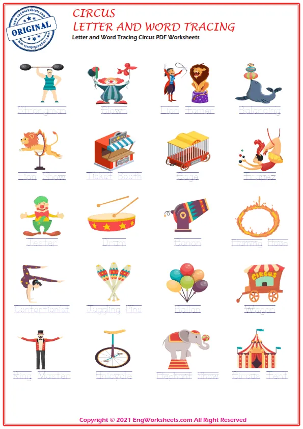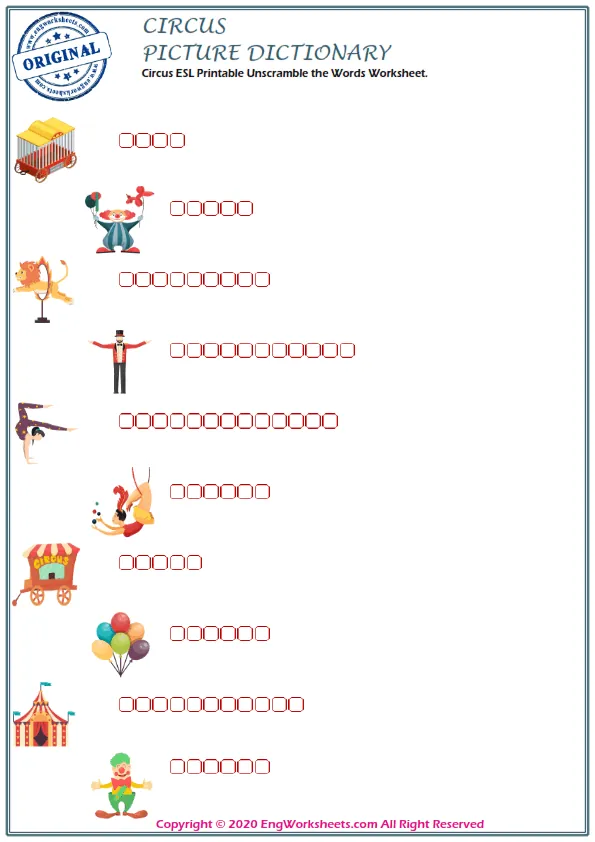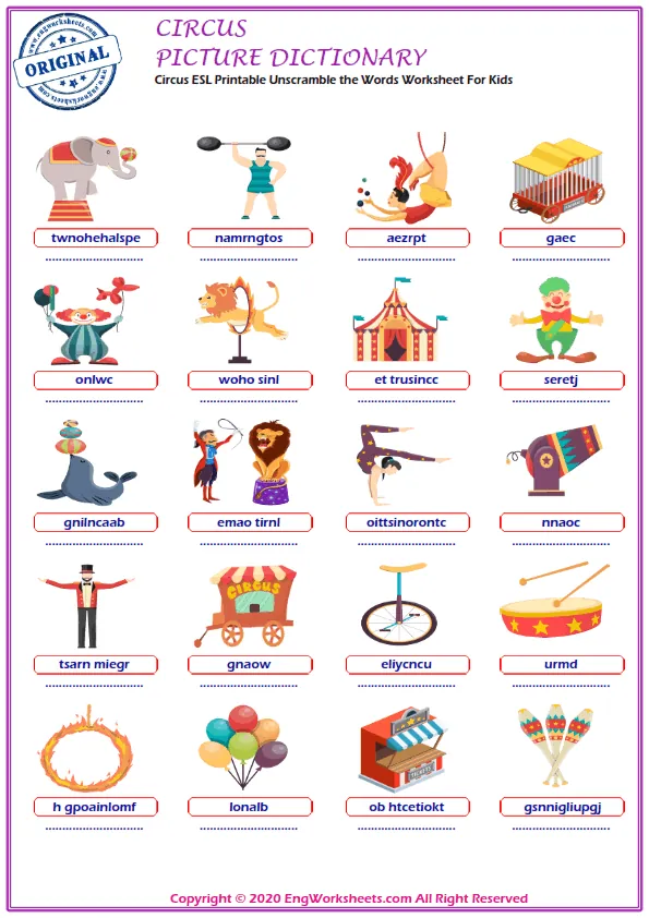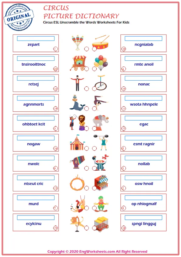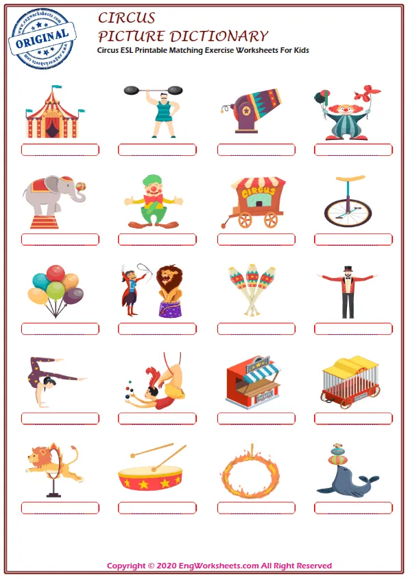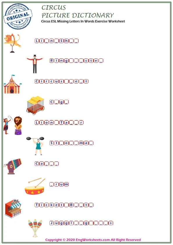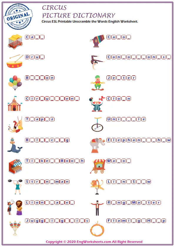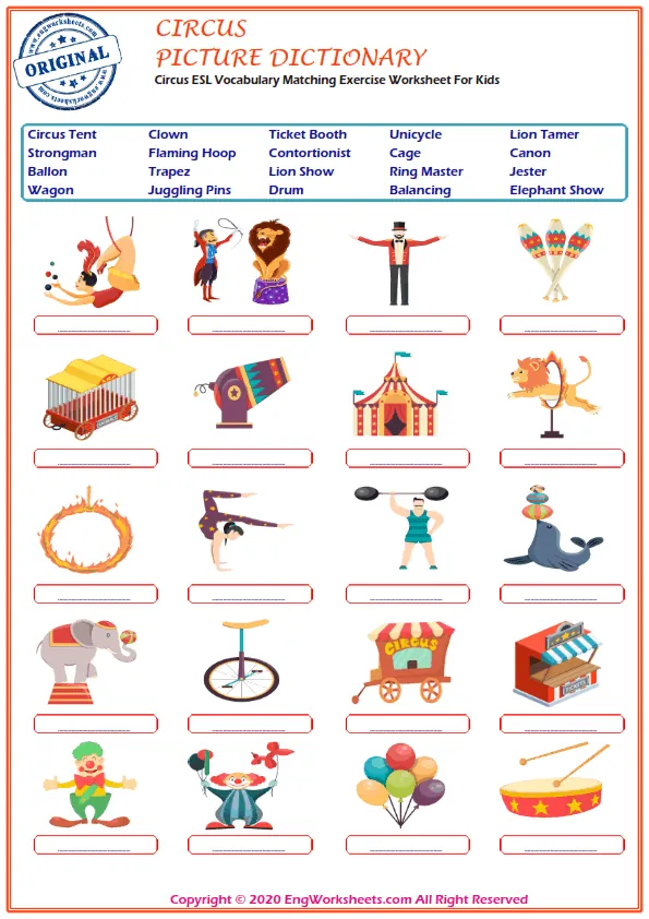Missing English Word Completion Worksheets, Word Matching Exercise Worksheets, and Activities for Finding Mixed Words can also be helpful resources for teaching circus-related vocabulary. These worksheets are designed to help learners complete sentences, match words with their definitions, and find circus-related words in mixed-up words, respectively. They are highly effective tools for helping students build their vocabulary skills related to the circus.