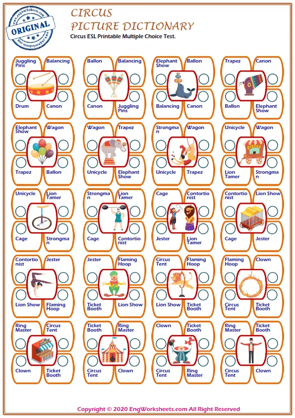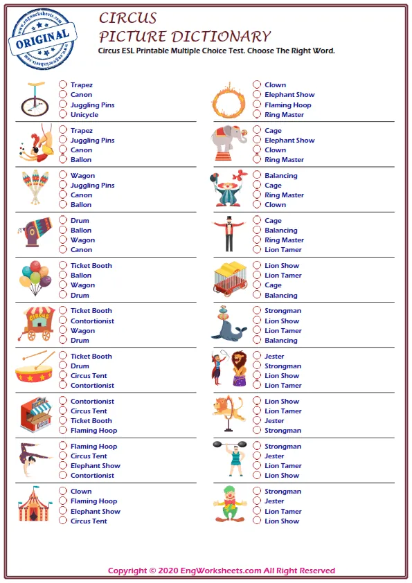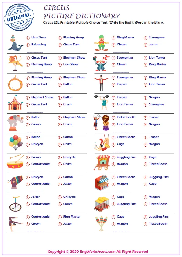 Finally, Multiple Choice English Tests can provide a more formal assessment of a student's knowledge and understanding of vocabulary related to the circus. These tests can be used by teachers to evaluate their students' progress or by individuals who want to test their own knowledge of circus-related vocabulary.