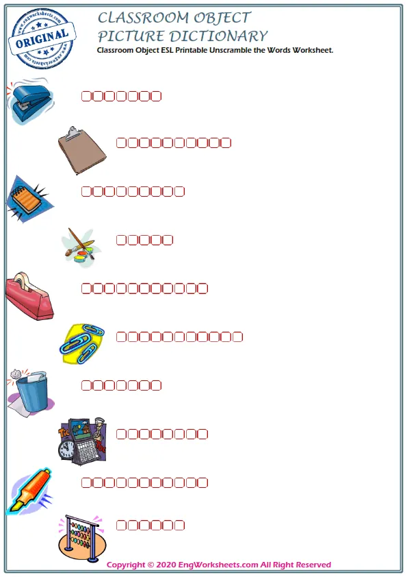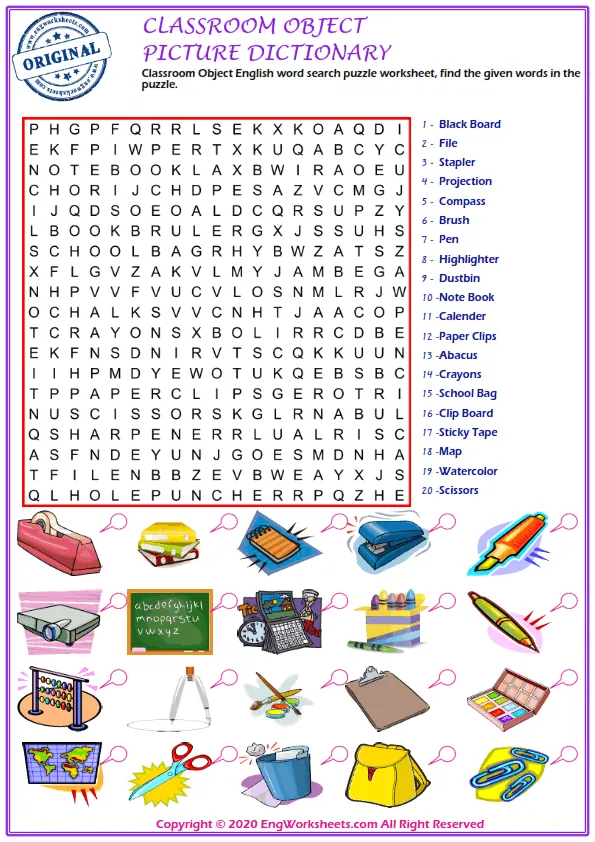 The Classroom Objects Free Printable English ESL Vocabulary Worksheets also feature exciting Activities for Finding Mixed Words, which make learning fun and interactive. These exercises are designed to help students improve their vocabulary skills and learn the names of different objects found in the classroom.