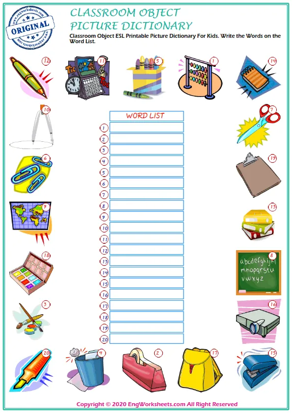 "Classroom Objects" are essential for any educational setting, and learning English vocabulary related to these objects is crucial for ESL learners. With the Classroom Objects Free Printable English ESL Vocabulary Worksheets, students can practice and master the words associated with the objects commonly found in classrooms.