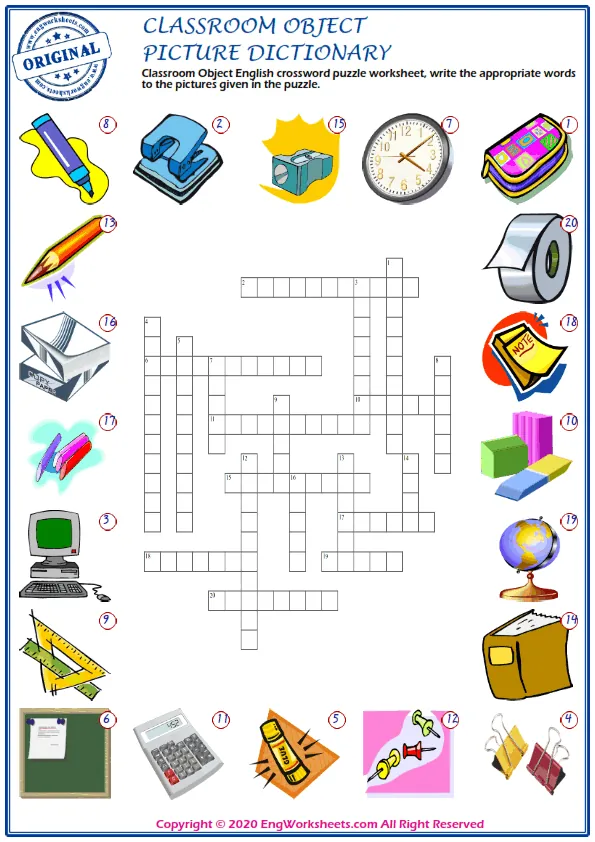 Introduce your students to an Illustrated Crossword Worksheet that focuses on Classroom Objects. This captivating educational tool is designed to improve students' understanding of common items found in the classroom. The visually appealing illustrations will engage learners as they work to solve the crossword puzzle, reinforcing their knowledge of Classroom Objects in English.