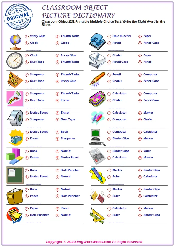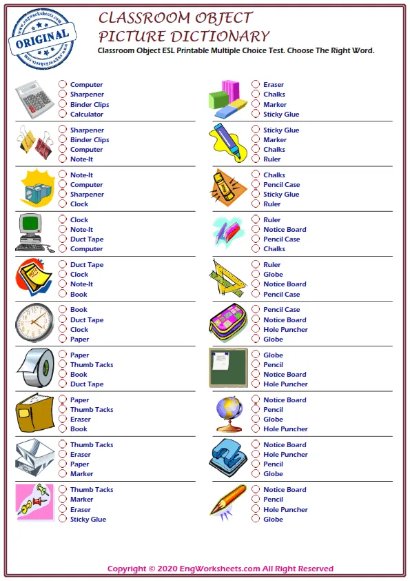 Finally, assess your students' progress with ESL Vocabulary learning exercises and Multiple Choice English Tests that feature Classroom Objects. These assessments will allow you to gauge students' understanding of classroom items and their corresponding English terms. By regularly evaluating students' proficiency, you can tailor your teaching to ensure mastery of Classroom Objects vocabulary.