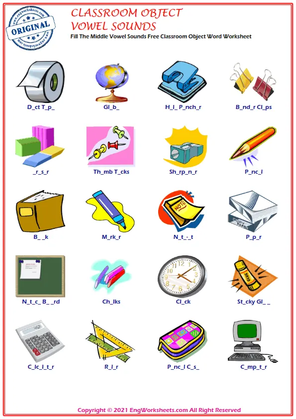 Utilize Missing English Word Completion Worksheets to assess students' understanding of Classroom Objects. These worksheets will help learners identify gaps in their vocabulary knowledge, as they work to complete sentences with the correct terms for Classroom Objects. This exercise will promote retention and mastery of essential English vocabulary.