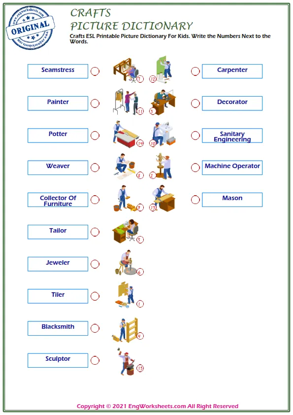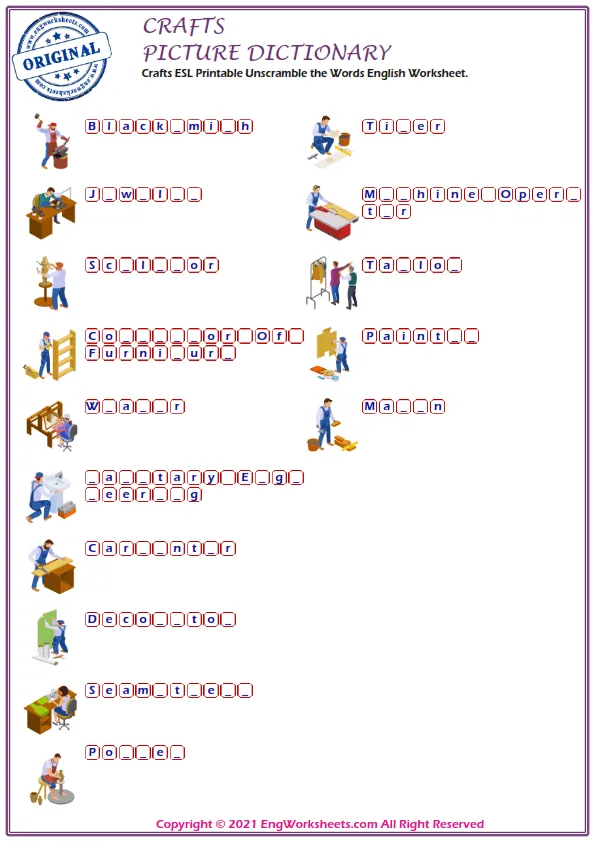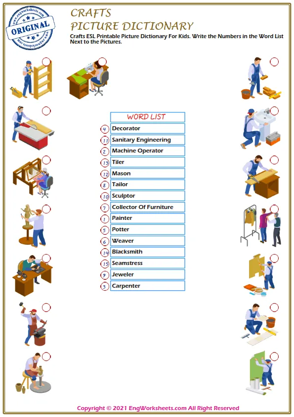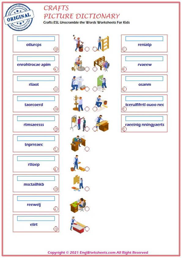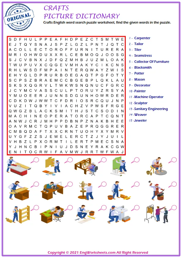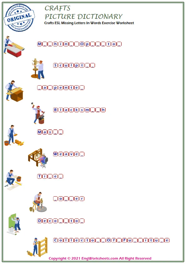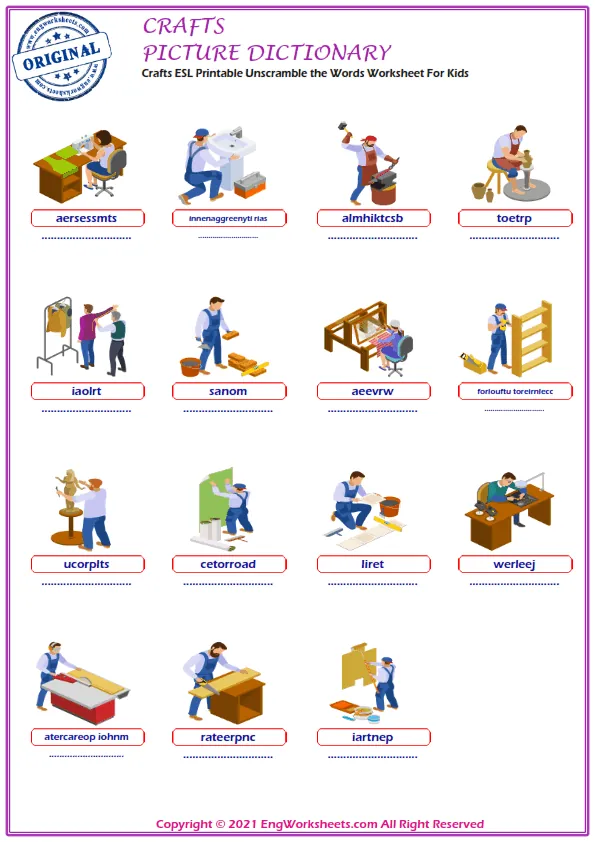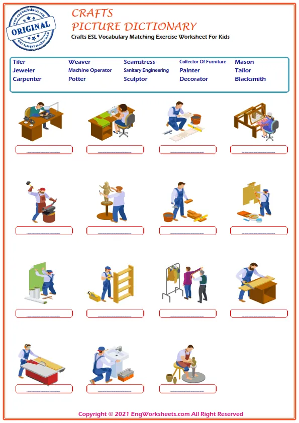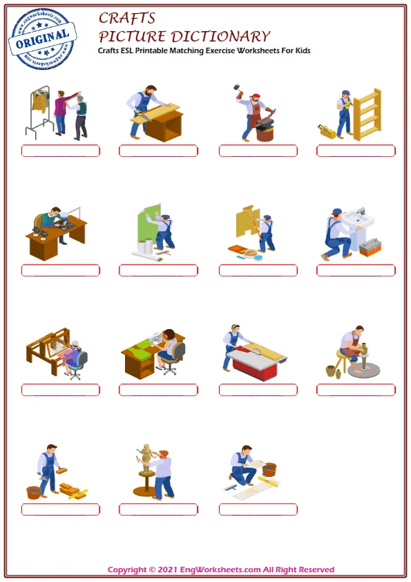 For a more challenging Crafts-related exercise, our Missing English Word Completion Worksheets or Word Matching Exercise Worksheet can help. These exercises require you to fill in the blanks or match Crafts-related words, allowing you to test your knowledge in a more advanced way.
