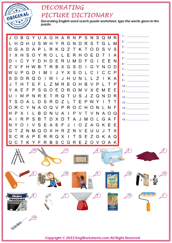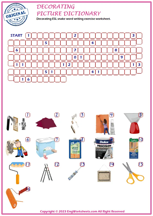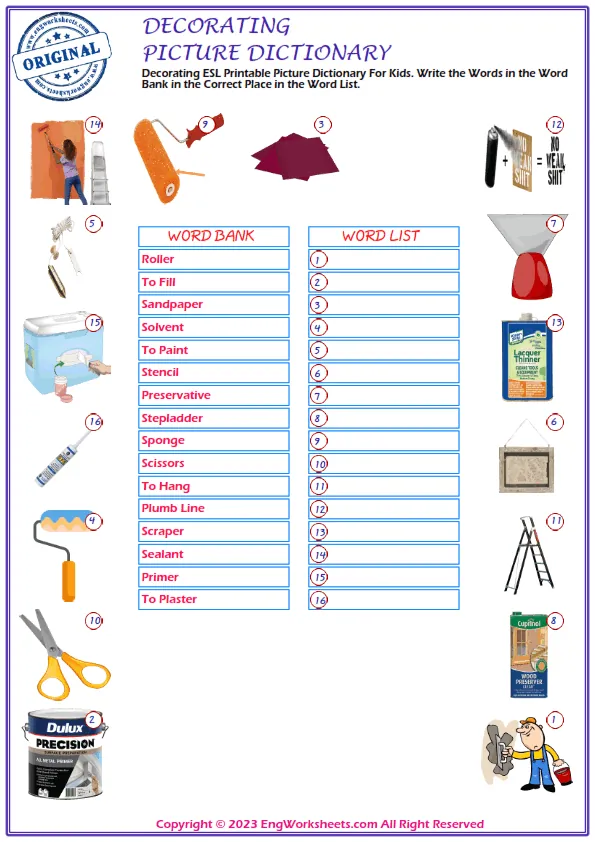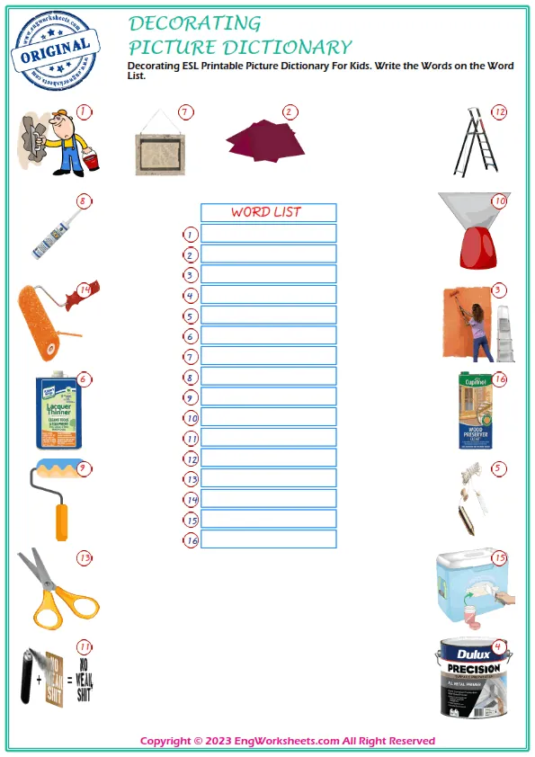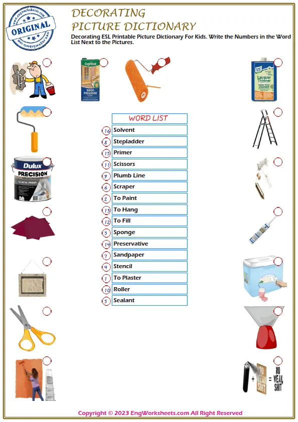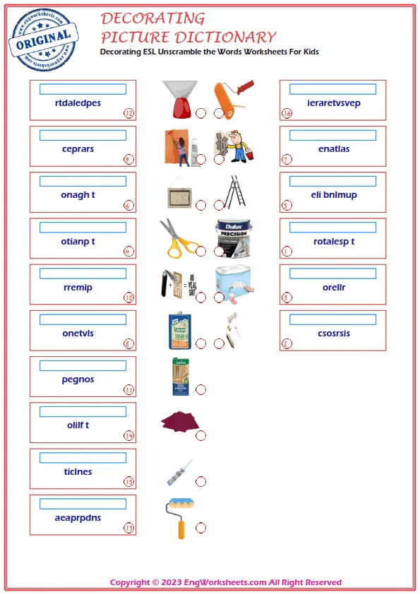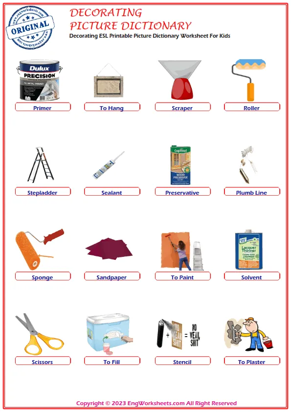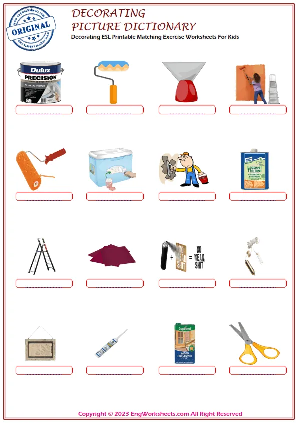 Decorating is a fun and creative activity that kids love to do, and it is important for them to understand the vocabulary associated with it. At our website, we offer a range of free printable English ESL vocabulary worksheets that are perfect for improving your child's language skills related to Decorating.