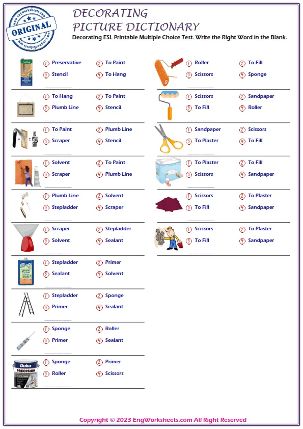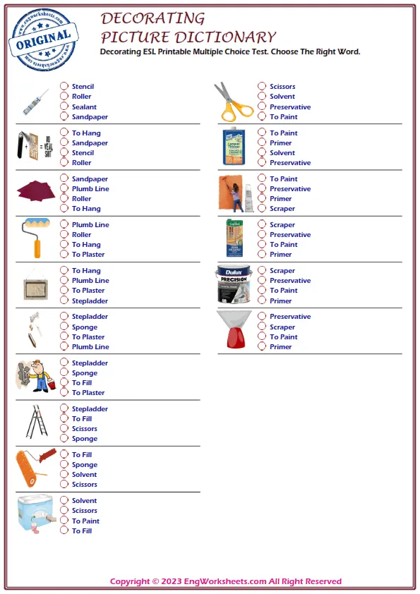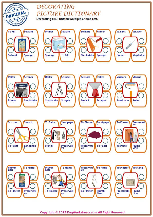 Finally, our Multiple Choice English Tests are a great way to test your child's Decorating-related vocabulary knowledge in a more formal setting. With a variety of questions and levels, these tests are an effective tool for assessing your child's progress and identifying areas for improvement.