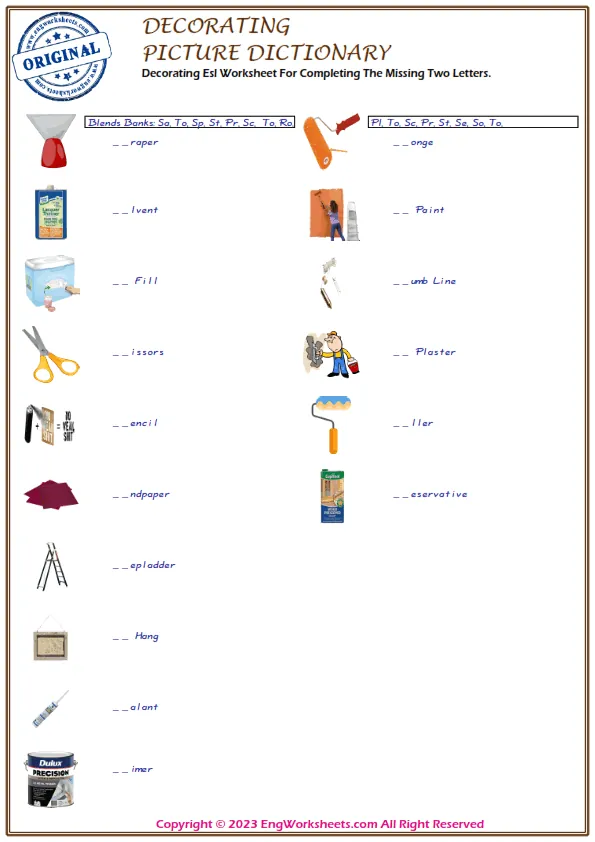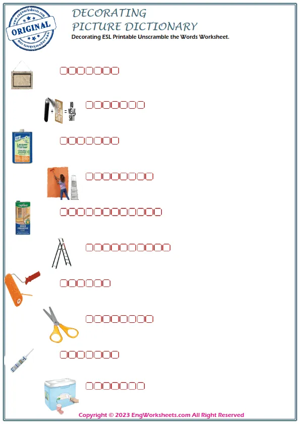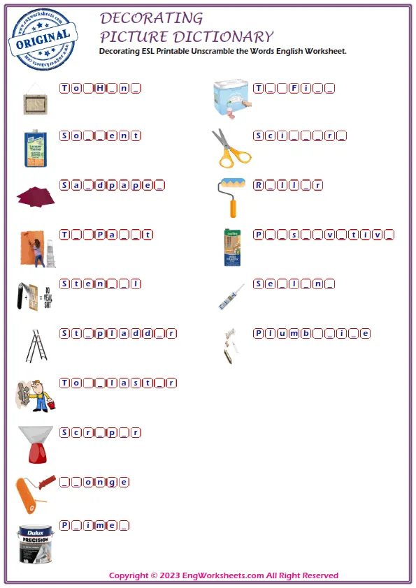 For a more challenging Decorating-related exercise, our Missing English Word Completion Worksheets or Word Matching Exercise Worksheet can help. These exercises require kids to fill in the blanks or match Decorating-related words, allowing them to test their knowledge in a more advanced way.
