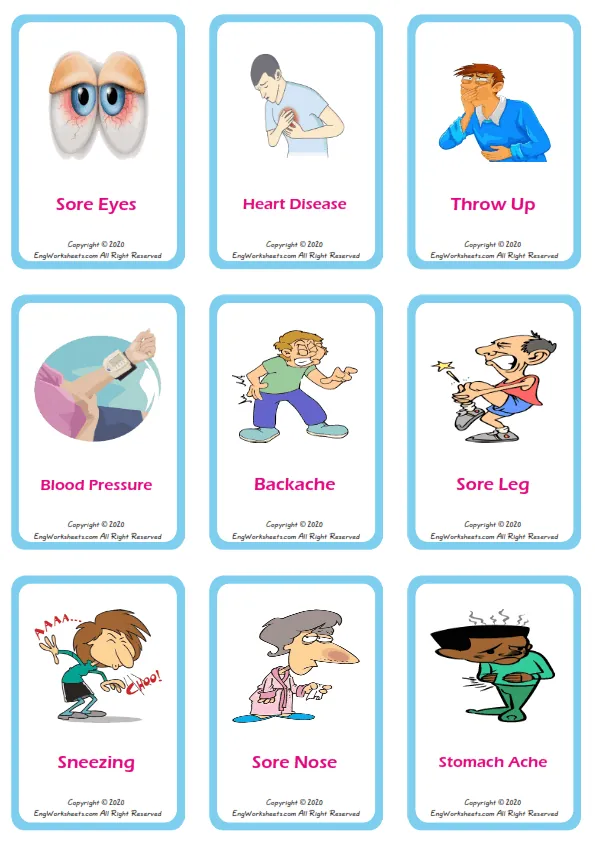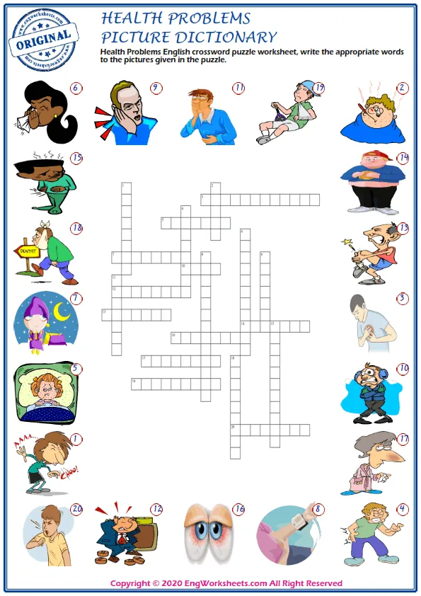 Our health problems worksheets include a variety of activities such as illustrated crossword puzzles, classroom posters in English, word search and word snake puzzles, missing word completion exercises, word matching exercises, activities for finding mixed words, ESL vocabulary learning exercises, and multiple choice English tests. With these resources, learners can practice their English language skills while learning important vocabulary related to health problems.