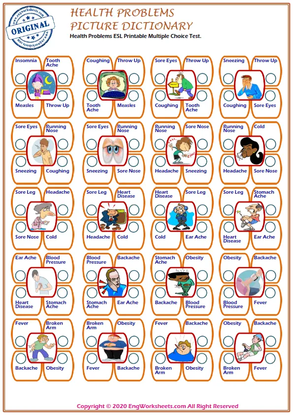 Finally, our multiple choice English tests provide a way for learners to assess their knowledge of health problems in a structured and standardized format. Whether you're an ESL teacher looking for classroom resources or a learner seeking to improve your English language skills, our health problems worksheets offer a fun and engaging way to learn important vocabulary.