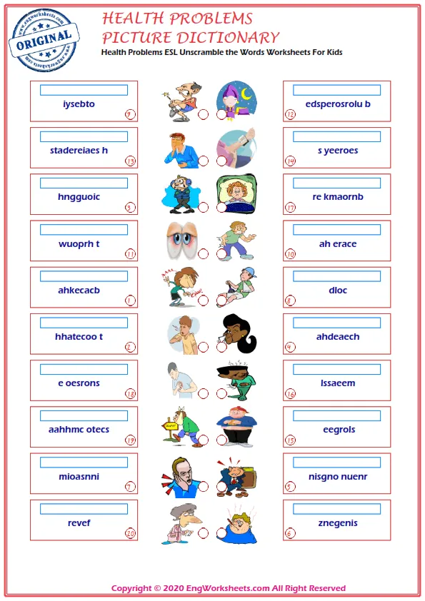 In addition to these worksheets, we also offer activities for finding mixed words and ESL vocabulary learning exercises. These exercises help learners to identify and understand the meaning of health problem related words in context.