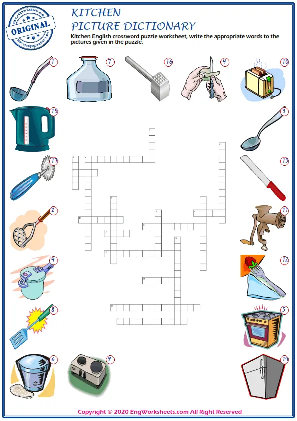 First up is our illustrated crossword worksheet. This puzzle is a great way to reinforce vocabulary related to kitchen items and their uses. With colorful illustrations to help guide learners, this crossword is a fun way to practice spelling and word recognition.