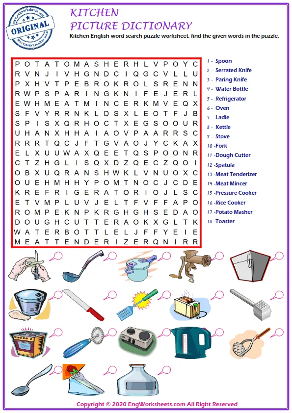 Our word search puzzle worksheet is another fun way to practice kitchen vocabulary. Learners can search for words related to cooking, baking, and kitchen utensils in this engaging activity. The puzzle can be done individually or in pairs, making it a great classroom activity.