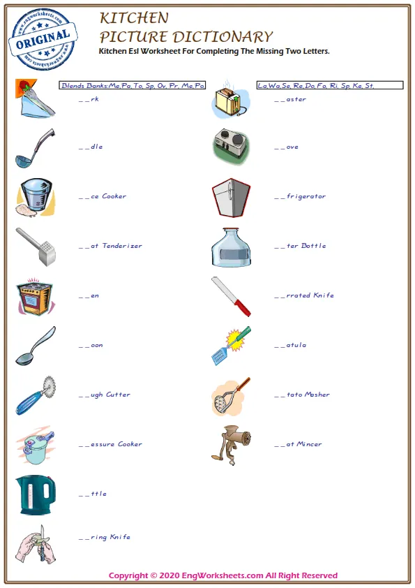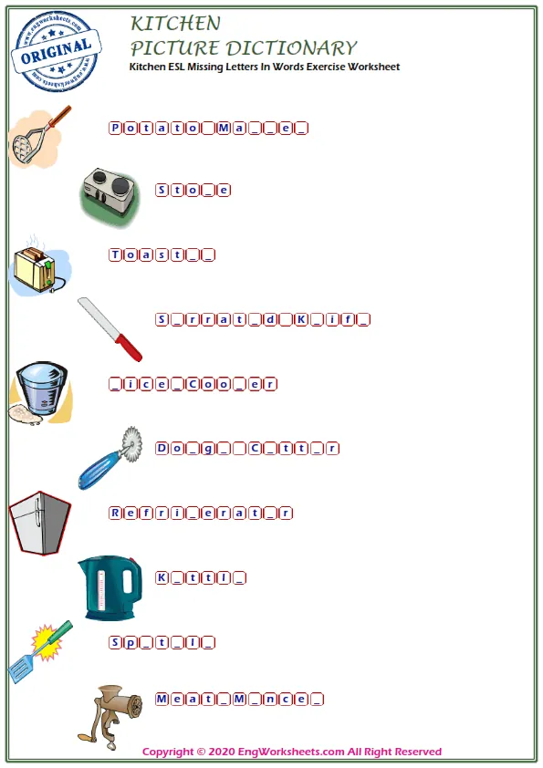 For learners who need extra practice with spelling, the missing English word completion worksheets are a great resource. These worksheets feature kitchen-related sentences with missing words for learners to complete. This activity is a great way to reinforce spelling and comprehension skills.