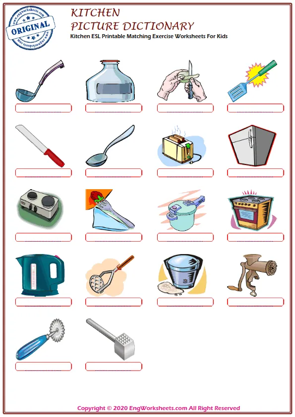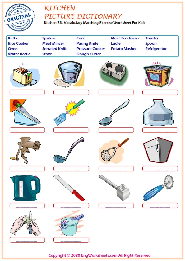 The word matching exercise worksheet is another engaging activity for learners to practice kitchen vocabulary. This exercise involves matching words to their corresponding pictures, making it a great visual aid for learners.