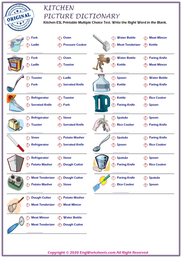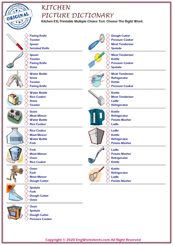 Finally, our multiple-choice English tests are a great way to assess learners' understanding of kitchen vocabulary. These tests include a range of questions related to cooking, baking, and kitchen utensils. They can be used as a formal assessment or as an informal tool for learners to practice their skills.
