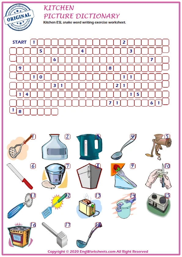 The word snake puzzle worksheet is another challenging yet fun activity for learners to practice their kitchen vocabulary. This exercise involves connecting words related to the kitchen in a snake-like pattern, requiring learners to think creatively and make connections between words.
