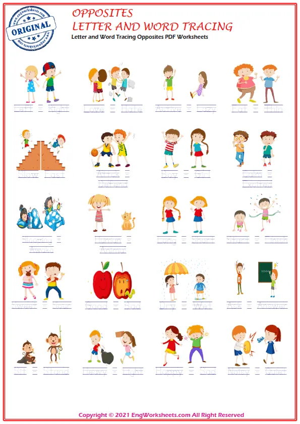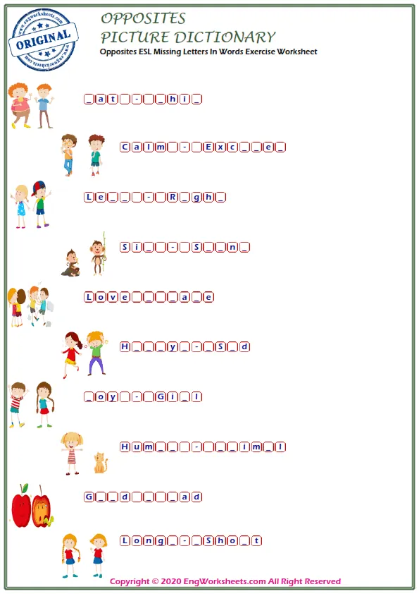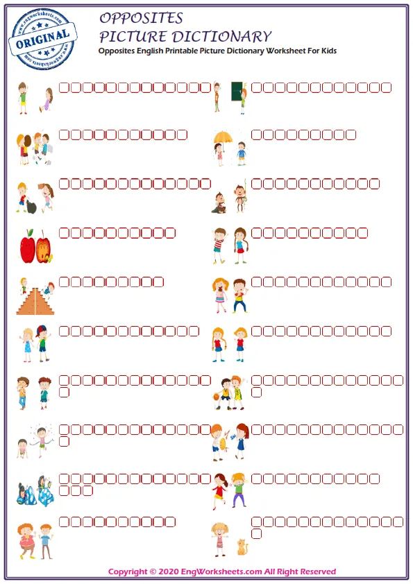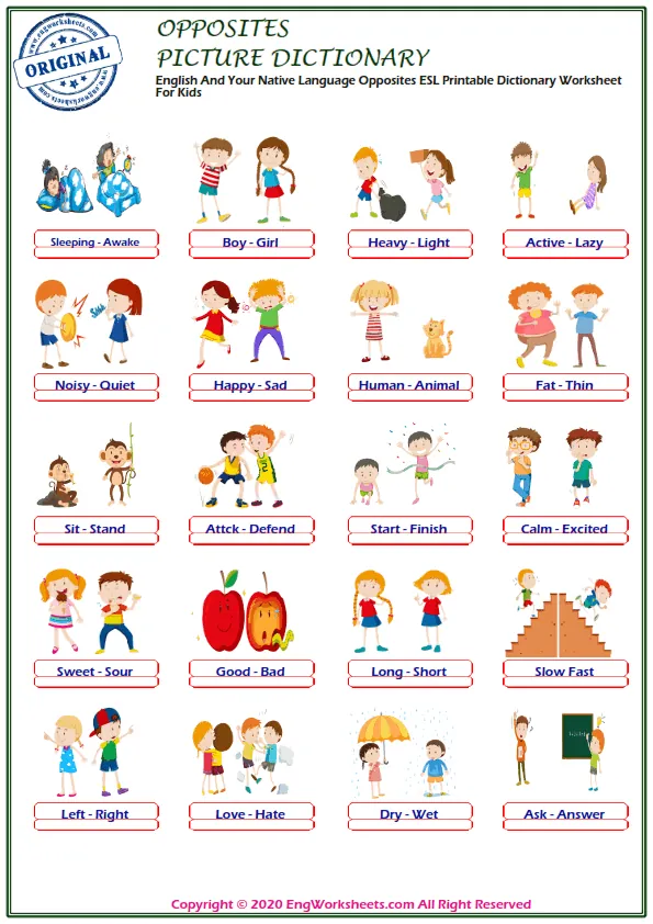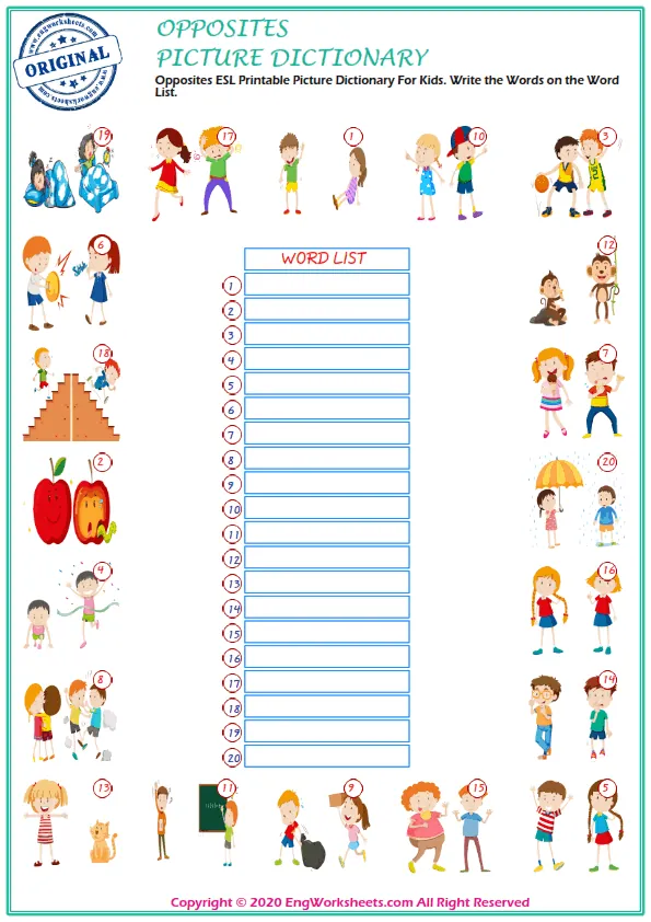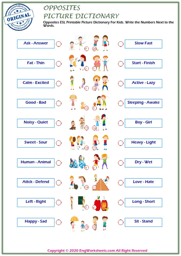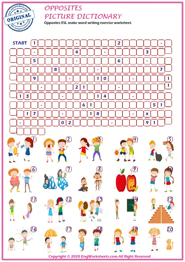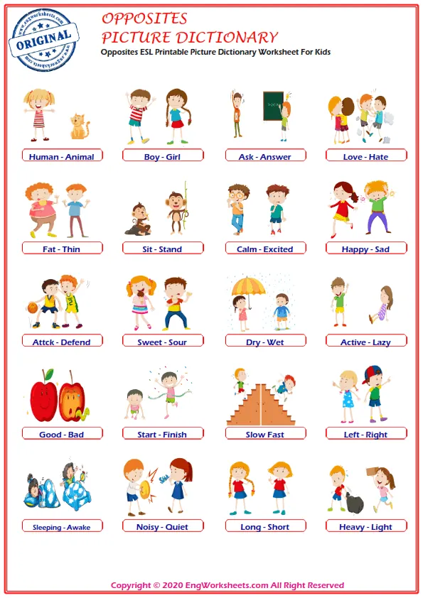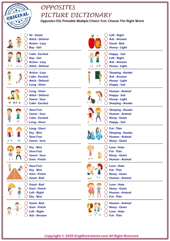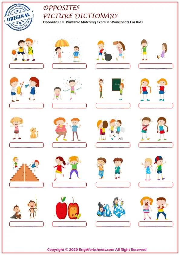 Discover a variety of Opposites ESL vocabulary learning exercises, including matching, fill in the blank, illustrated, and word puzzle activities. These Opposites worksheets are an engaging supplement for vocabulary lessons and support learning for students of all ages and skill levels. Use them in the classroom or at home to improve comprehension, strengthen reading, and build language fluency.