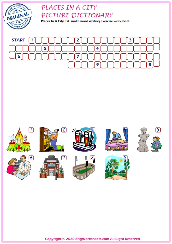 If you're up for a challenge, try our word search puzzle worksheet or word snake puzzle worksheet. These puzzles require you to search for or connect words related to places in a city. They're a great way to build vocabulary while also practicing critical thinking skills.