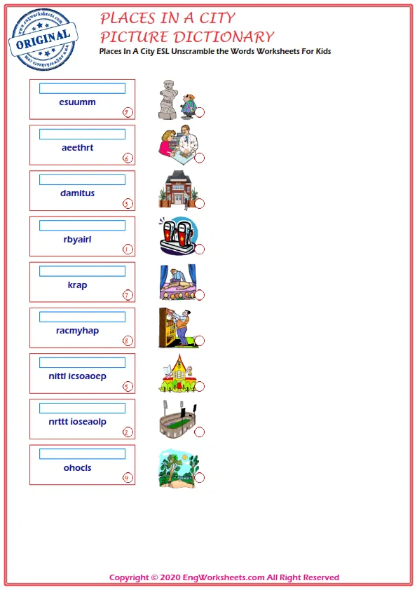 For a more interactive approach, try our missing English word completion worksheets or word matching exercise worksheet. These exercises require you to fill in missing words or match words to their definitions, helping you to reinforce your understanding of Places In A City vocabulary.