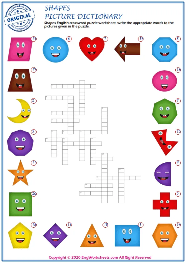 One type of Shapes Free Printable English ESL Vocabulary Worksheet is the Illustrated Crossword Worksheet. This worksheet includes a series of pictures and clues related to different shapes, and students are asked to fill in the crossword puzzle with the appropriate names of shapes. By completing this exercise, students can become more familiar with a variety of shapes in English.