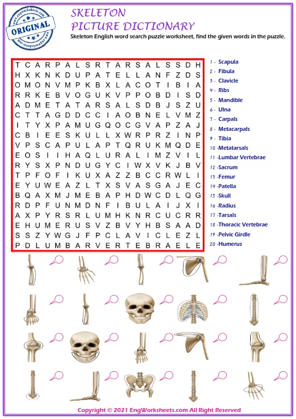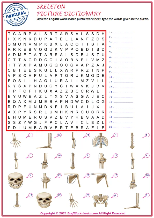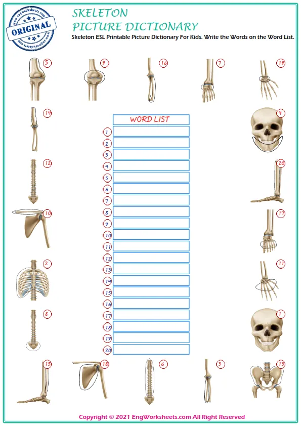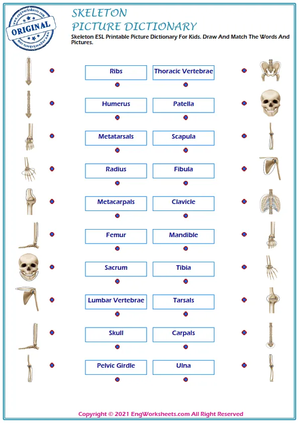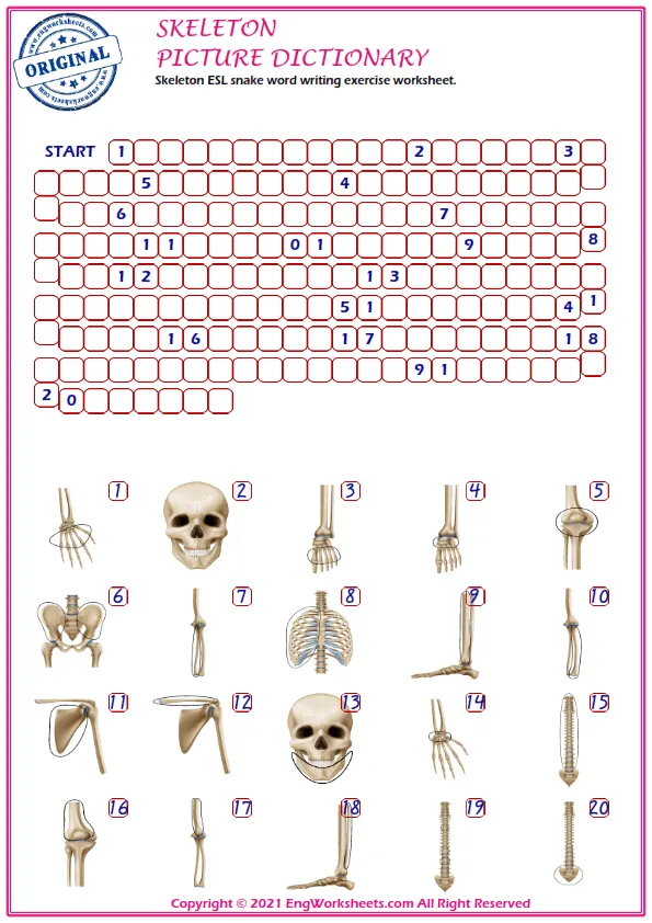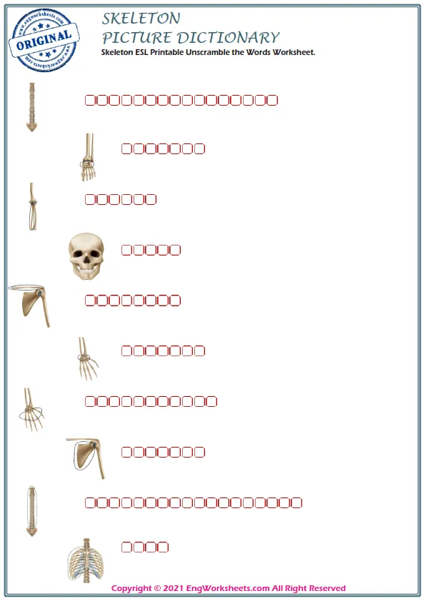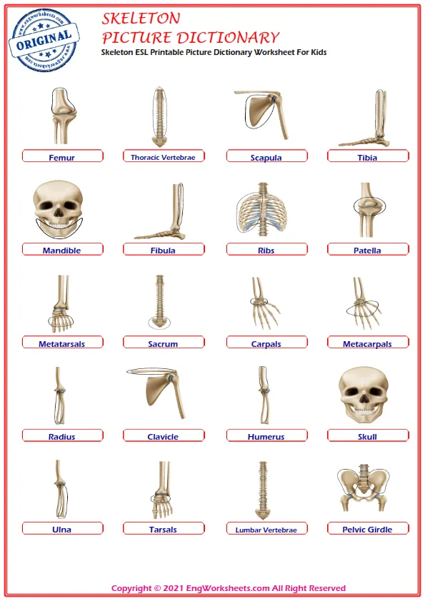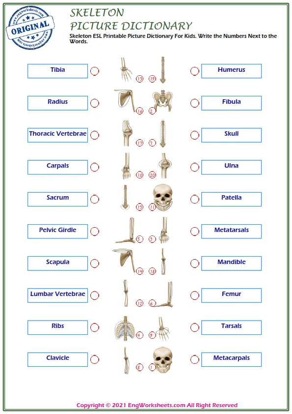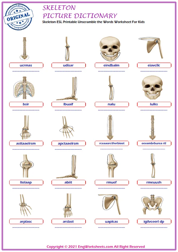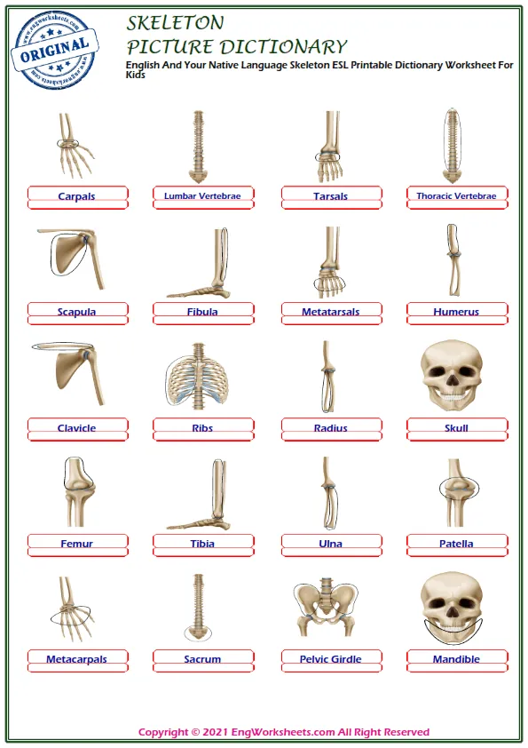 The human Skeleton is a fascinating part of our body, and it is important for kids to understand the vocabulary associated with it. At our site, we offer a range of free printable English ESL vocabulary worksheets that are perfect for improving your child's language skills related to the Skeleton.