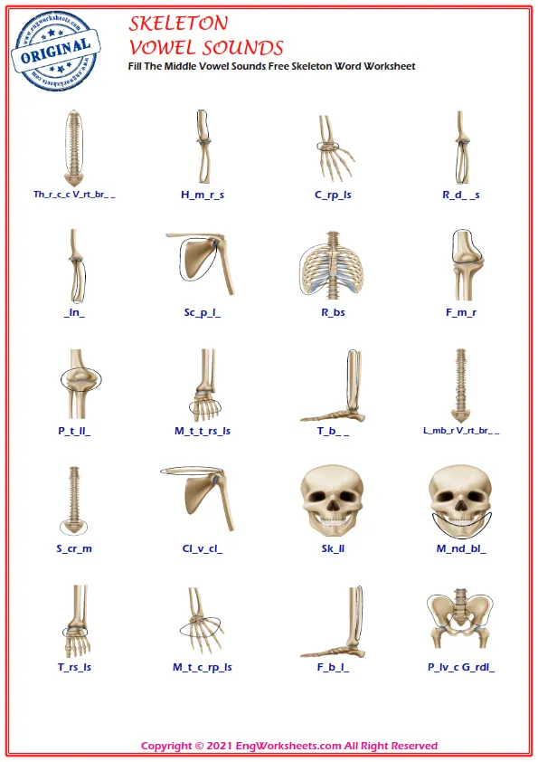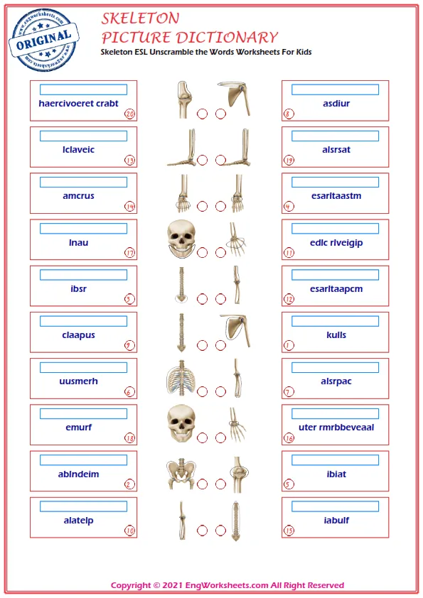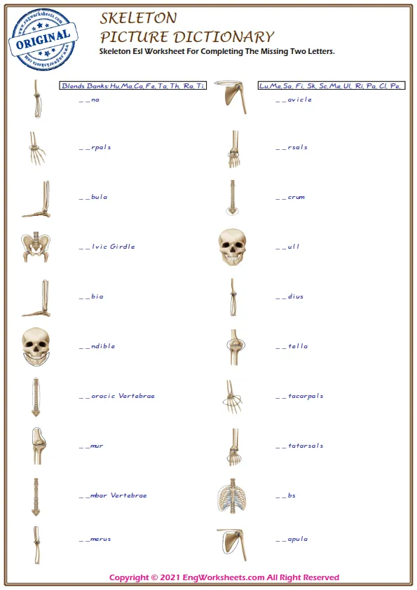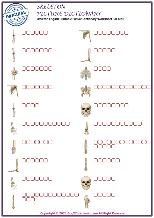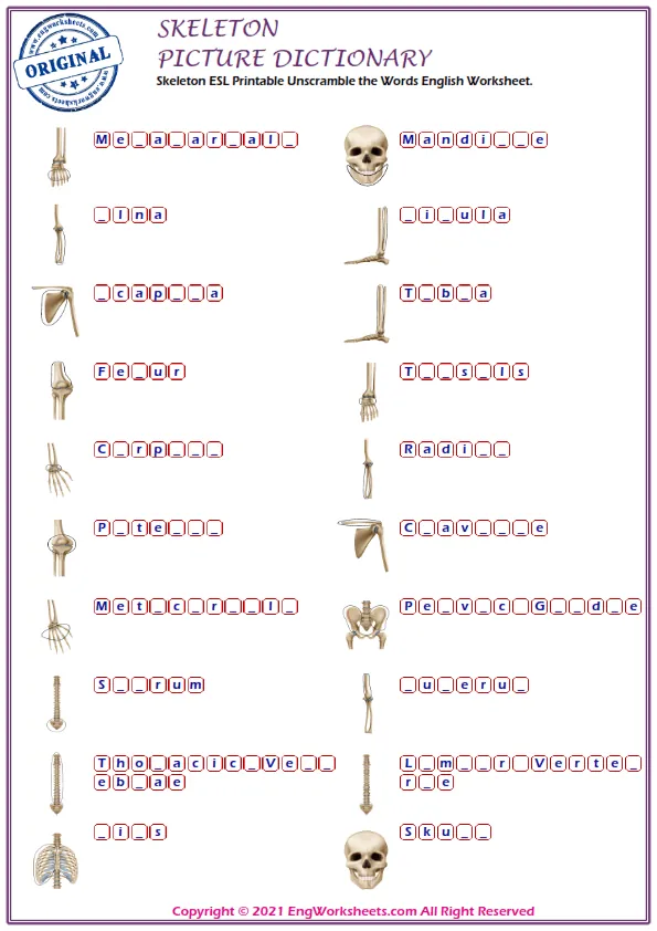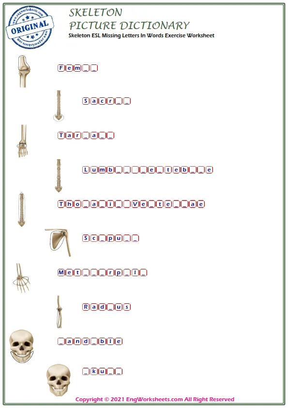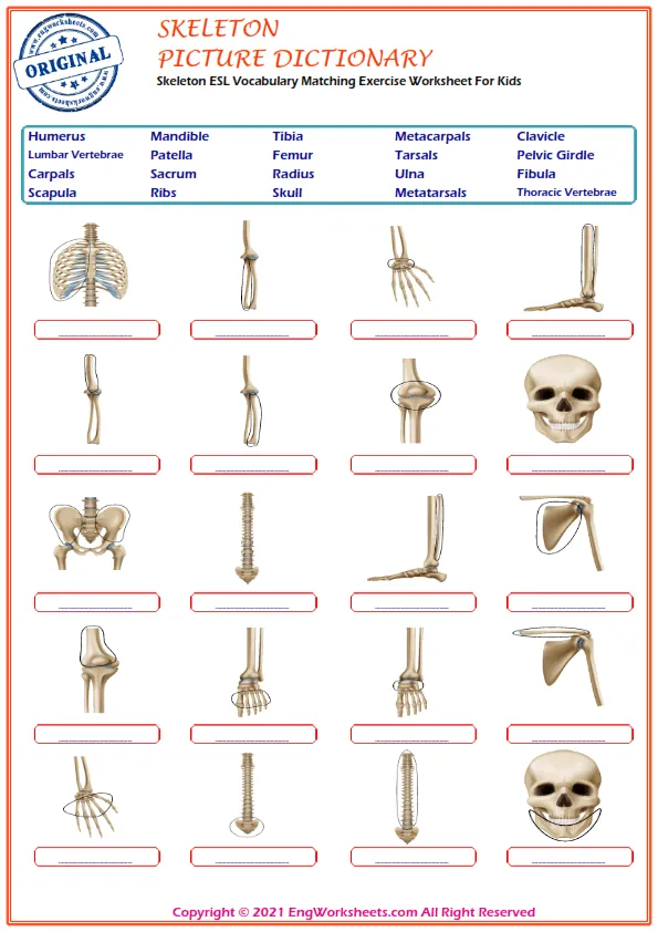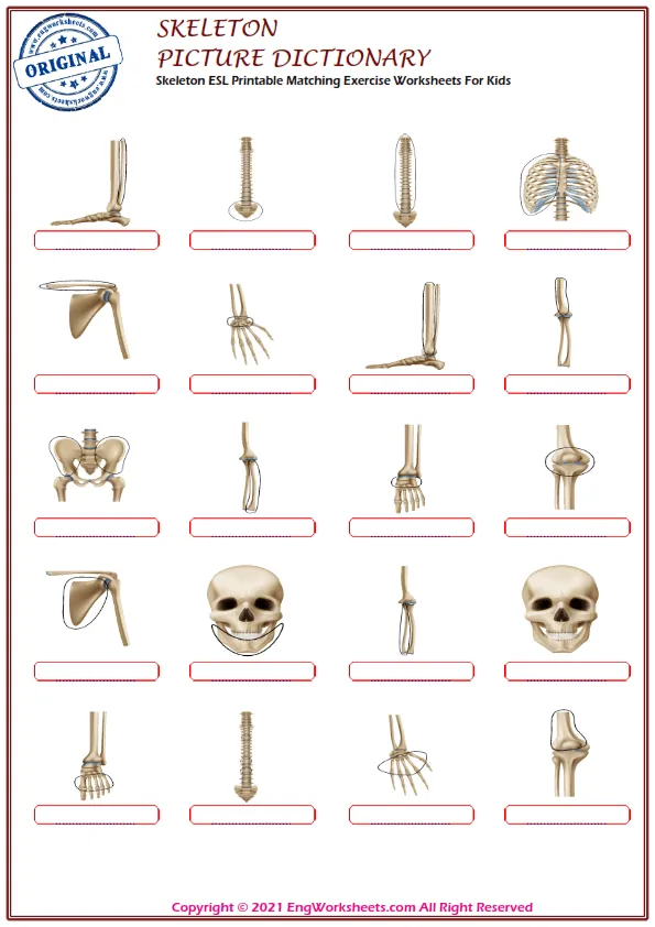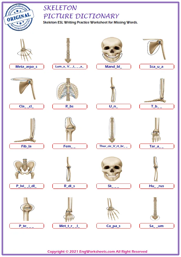 For a more challenging Skeleton-related exercise, our Missing English Word Completion Worksheets or Word Matching Exercise Worksheet can help. These exercises require kids to fill in the blanks or match Skeleton-related words, allowing them to test their knowledge in a more advanced way.