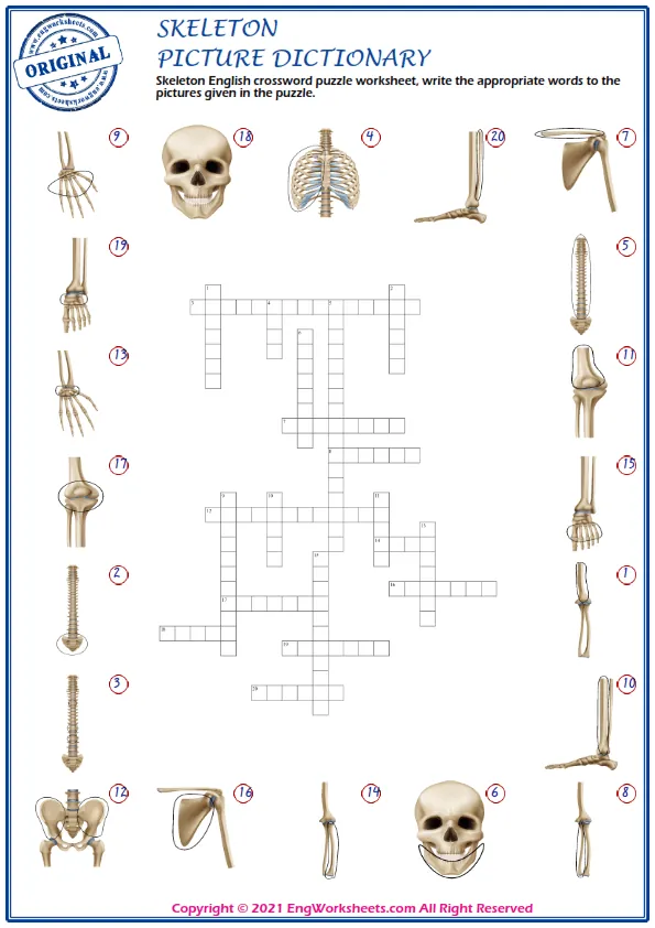 Our Skeleton-themed Illustrated Crossword Worksheet is a fun and interactive way for kids to learn new words related to the Skeleton. It features colorful illustrations and challenging clues that help your child to practice and reinforce their understanding of Skeleton-related vocabulary.