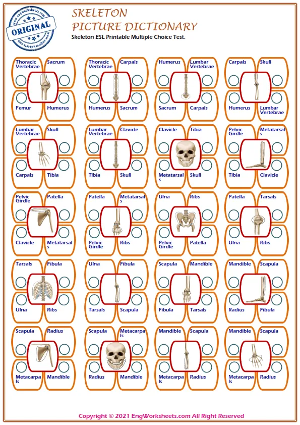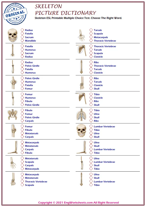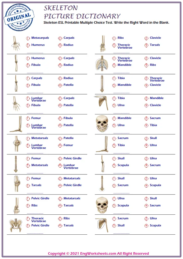 Finally, our Multiple Choice English Tests are a great way to test your child's Skeleton-related vocabulary knowledge in a more formal setting. With a variety of questions and levels, these tests are an effective tool for assessing your child's progress and identifying areas for improvement.
