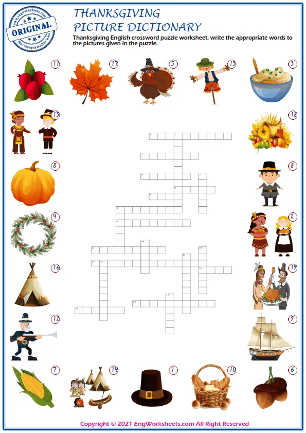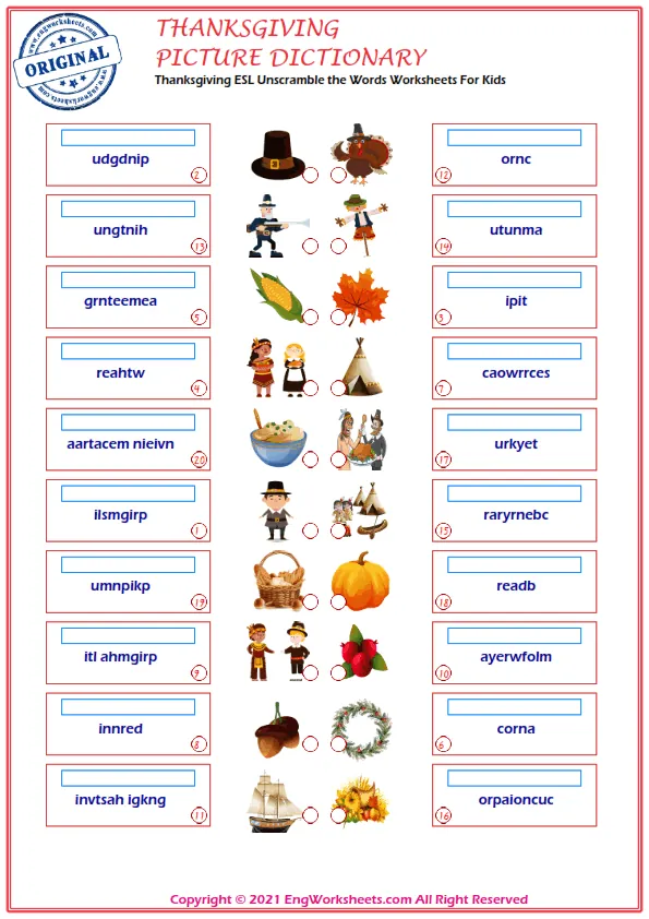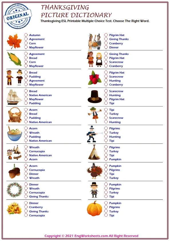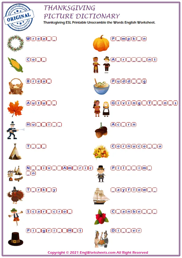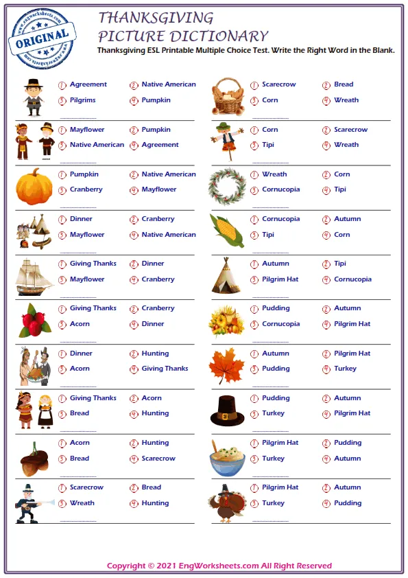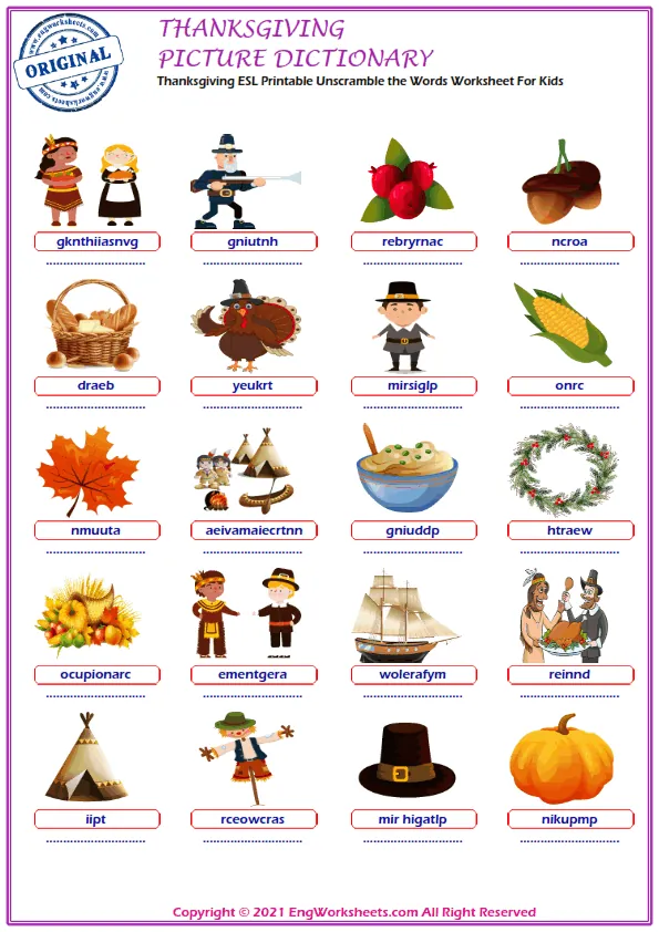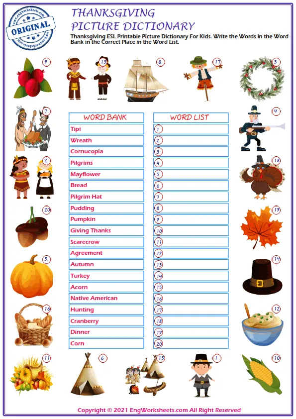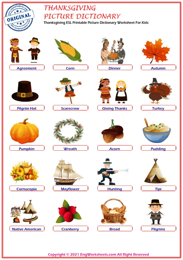 Thanksgiving is a holiday celebrated in the United States and Canada, and it's a great opportunity for teachers to engage their students in English language learning with Thanksgiving-themed activities. Here are some fun and educational Thanksgiving ESL printable English worksheets and exercises for kids.