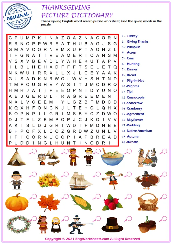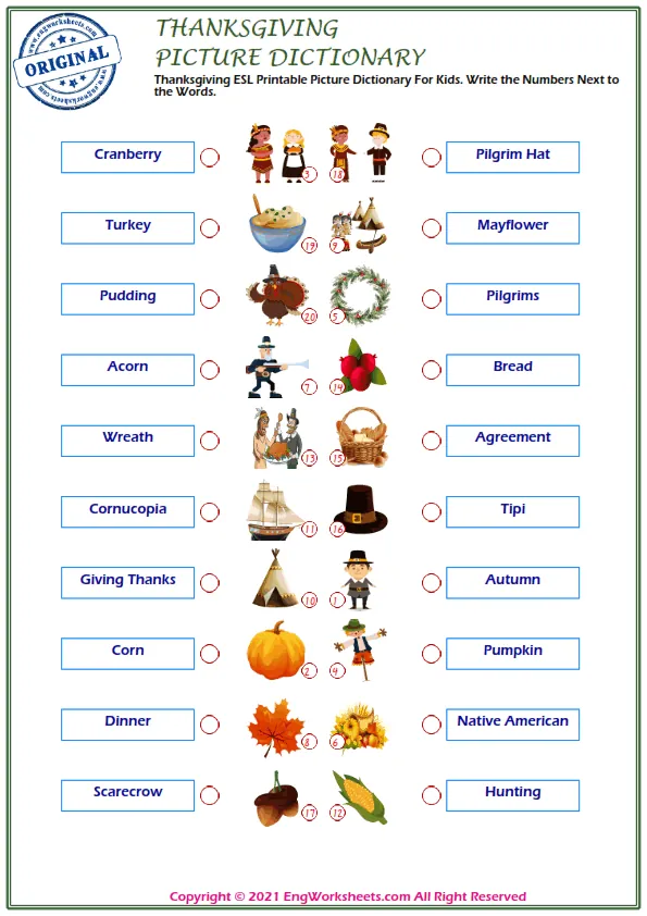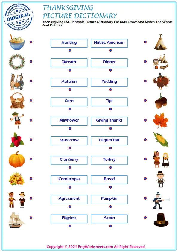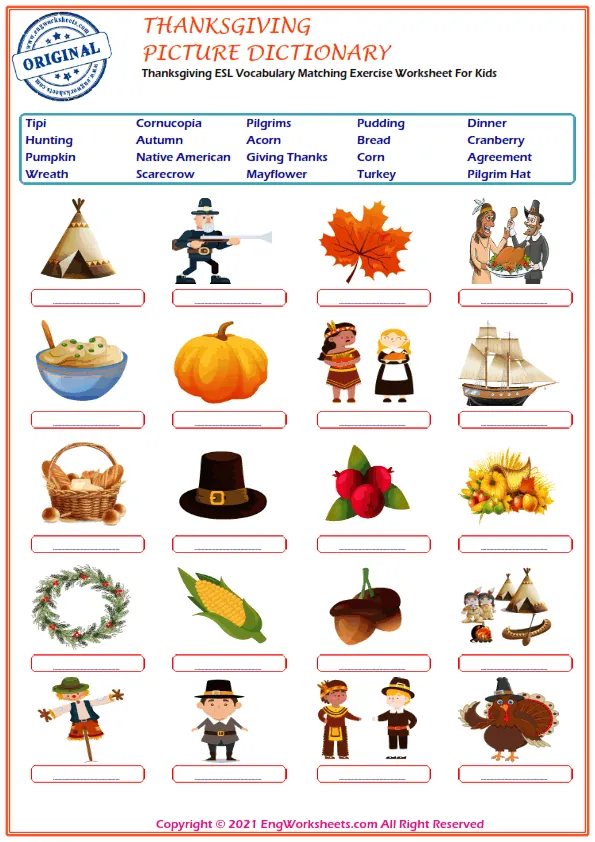 Word matching exercises are another fun and educational Thanksgiving activity for ESL students. This exercise challenges students to match Thanksgiving-themed words with their corresponding illustrations, improving their vocabulary and reading comprehension skills.