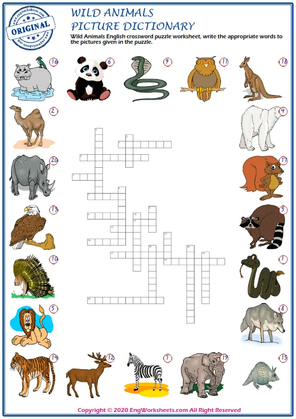 Our Wild Animals-themed Illustrated Crossword Worksheet is a fun way to test your knowledge of English vocabulary related to various wild animals. With colorful illustrations and challenging clues, this worksheet is a great tool for practicing your wild animal-related vocabulary while having fun.