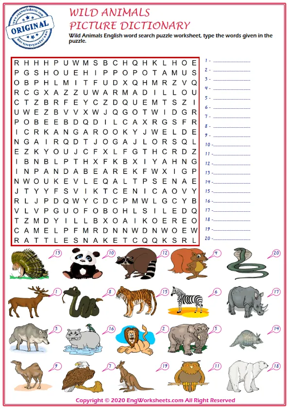 For a more interactive wild animal-related learning experience, try our Word Search Puzzle Worksheet or Word Snake Puzzle Worksheet. These puzzles challenge you to find wild animal-related words hidden within a grid or snake of letters, helping you to improve your vocabulary and spelling skills.