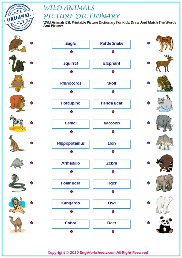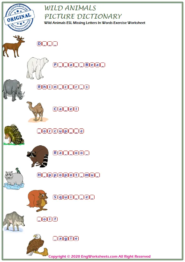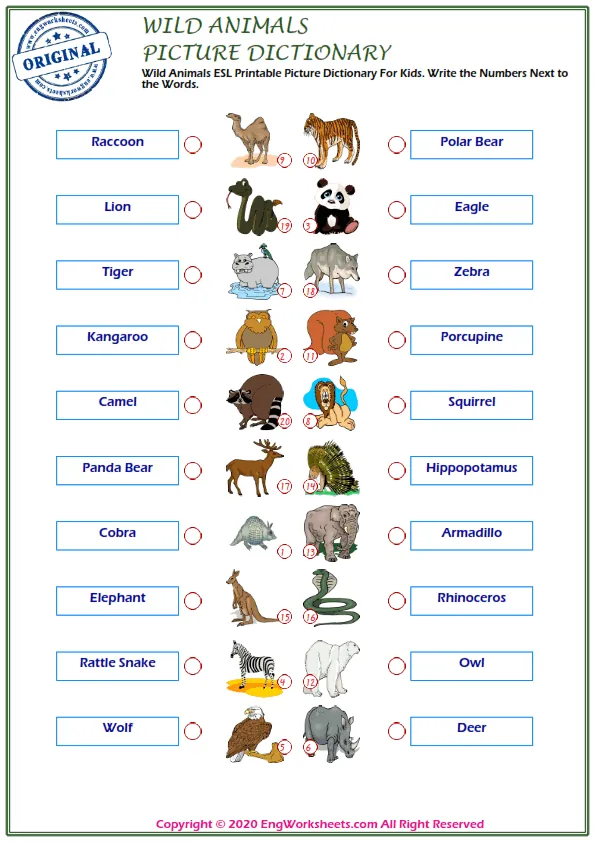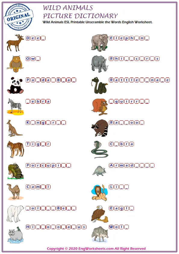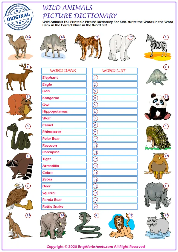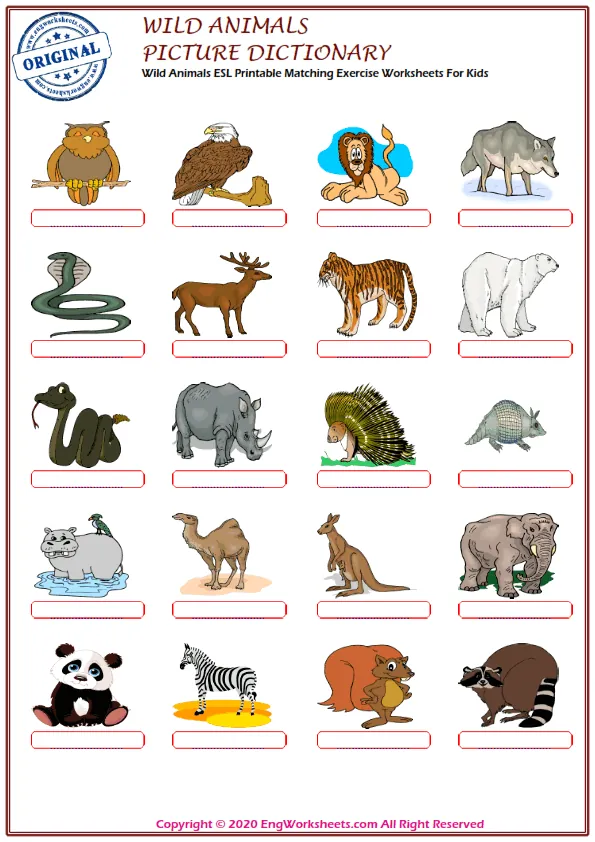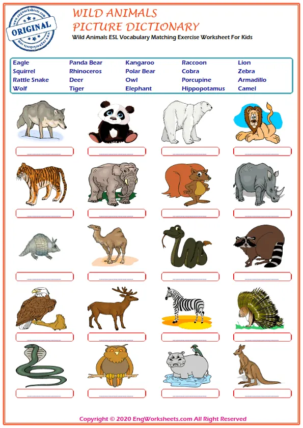 If you're looking for a more challenging wild animal-related exercise, our Missing English Word Completion Worksheets or Word Matching Exercise Worksheet may be just what you need. These exercises require you to fill in the blanks or match wild animal-related words, allowing you to test your knowledge in a more advanced way.