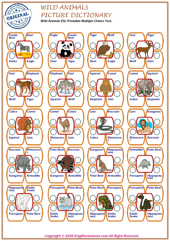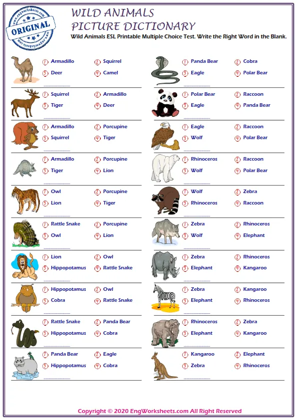 Finally, our Multiple Choice English Tests are a great way to test your wild animal-related vocabulary knowledge in a more formal setting. With a variety of questions and levels, these tests are a great way to assess your progress and identify areas for improvement.